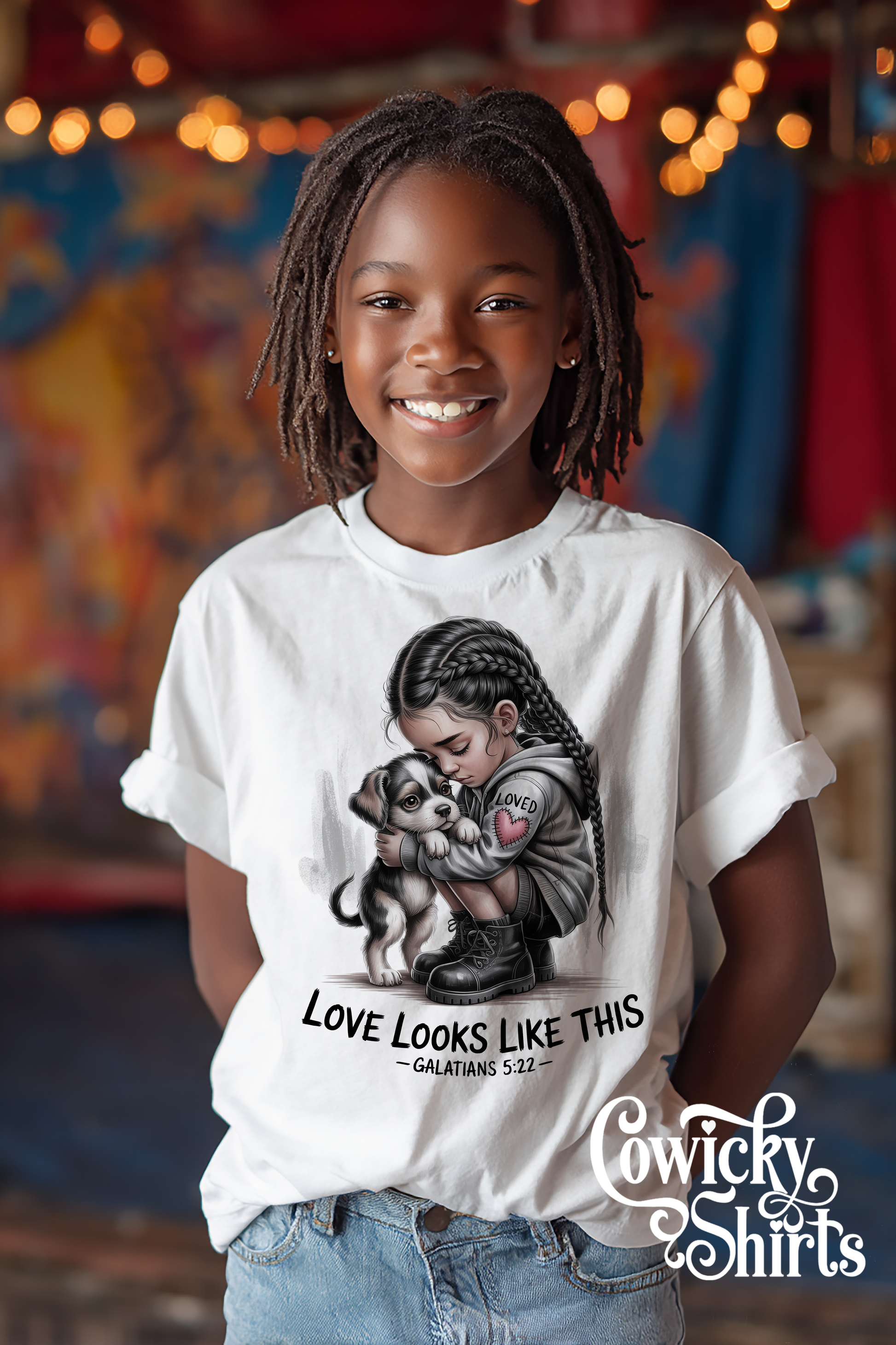 This bold front-and-back tee features a punk baby with a giant stitched heart on their back, kneeling in kindness with a friend in need. The graffiti-style “Love Looks Like This” lettering brings Galatians 5:22 to life in a raw, heart-filled way. It’s faithwear for misfit kids learning how to love big — and stand strong doing it.