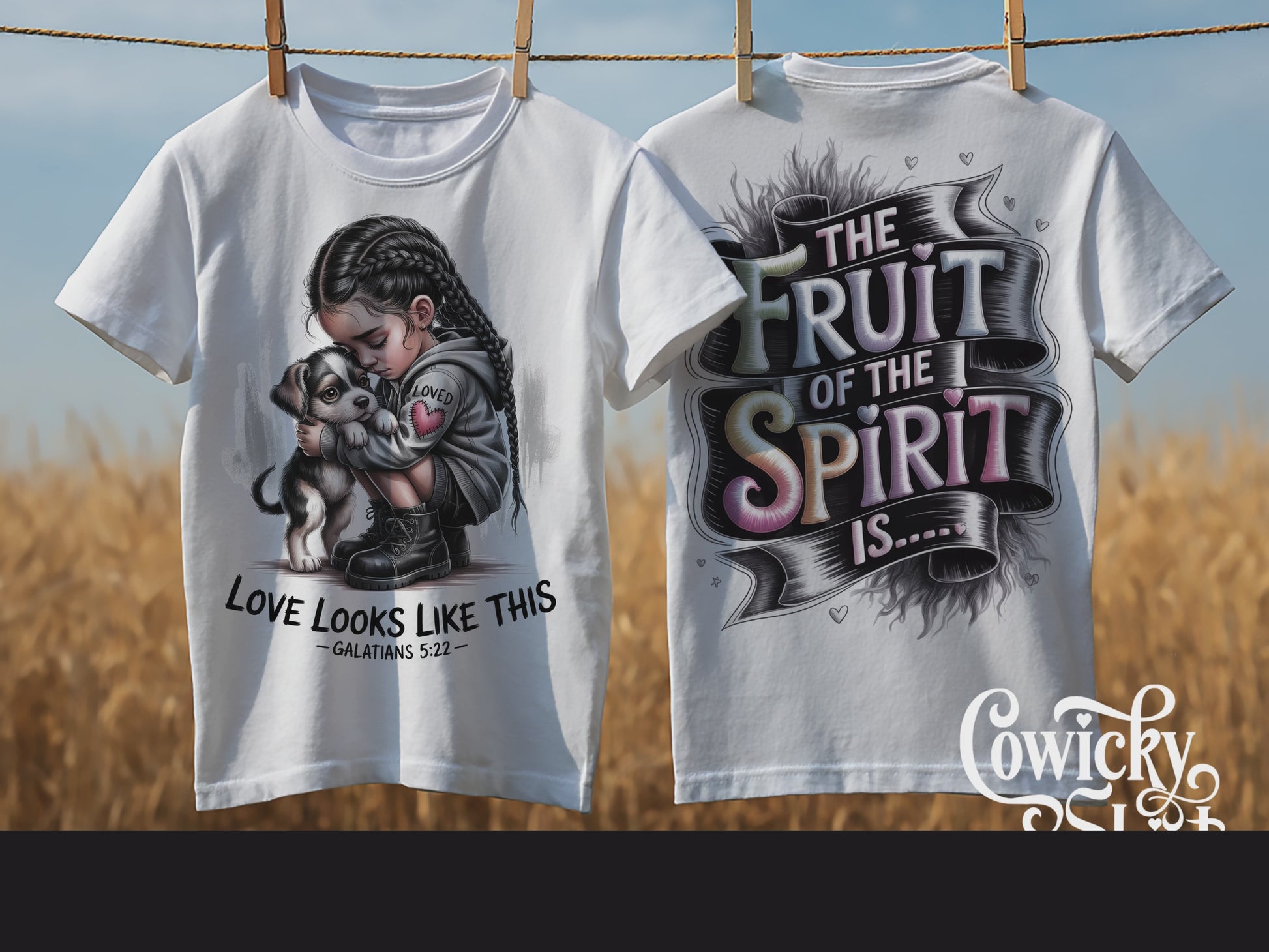 Front & back design (front: punk baby + heart / back: “The Fruit of the Spirit is…” banner)